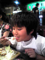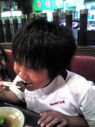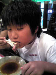 焼きあがったお肉を食べる幸平 |