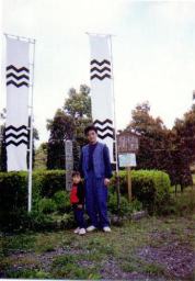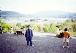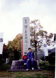| 笹尾山から見た関ヶ原一体を バックに記念写真。 三成公はここにて関ヶ原合戦の 采配を 取ってました。 関ヶ原が一望できます。 |