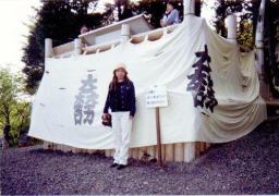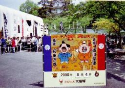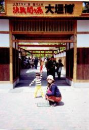 翌日は朝から大垣城にて 行われていた 「決戦関ヶ原大垣博へ」 入り口でポーズを取っている幸平 |